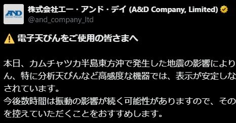「電子天びんなどでの計量、数時間控えて」 メーカーが呼び掛け 地震で表示が安定しない報告相次ぐ計量機器メーカーのエー・アンド・デイ(東京都豊島区)は7月30日午前11時ごろ、電子天びんや分析天びんなど、高感度な計量機器の利用を数時間程度控えるよう公式Xアカウントで呼び掛けた。同日午前8時25分ごろ、カムチャツカ半島付近で発生したM8...www.itmedia.co.jp - 2 : 2025/07/30(水) 17:10:45.10 ID:mOxDJ419