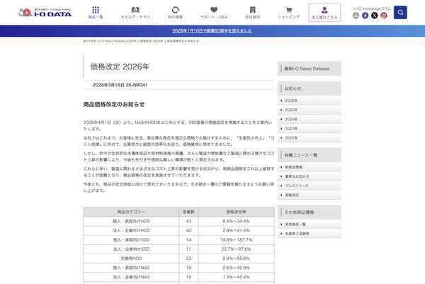 【アイ・オー・データ機器】アイ・オー値上げ SSD最大187.7%、USBメモリー最大224.0%