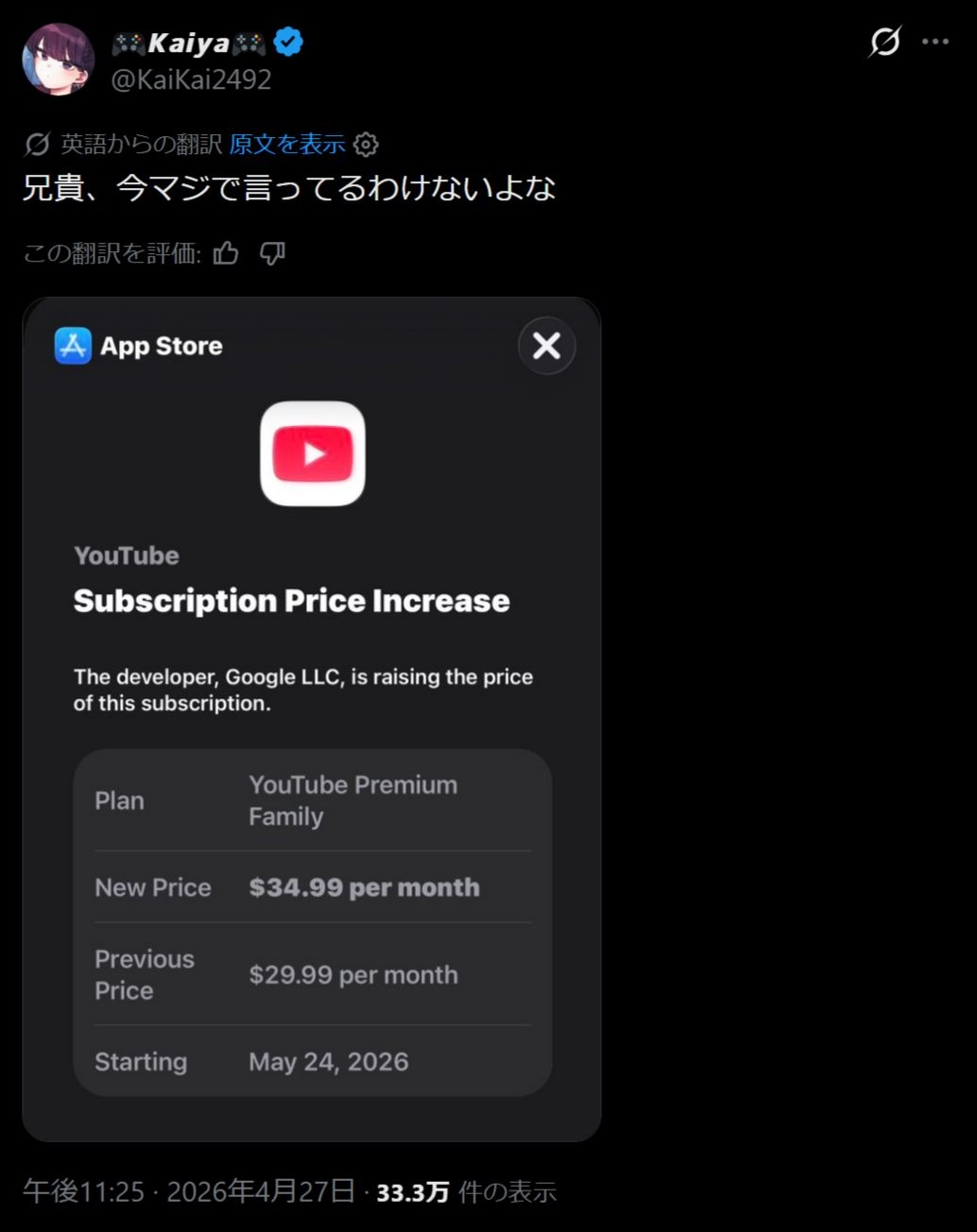 YouTube「5月末から有料プランを新価格にします」